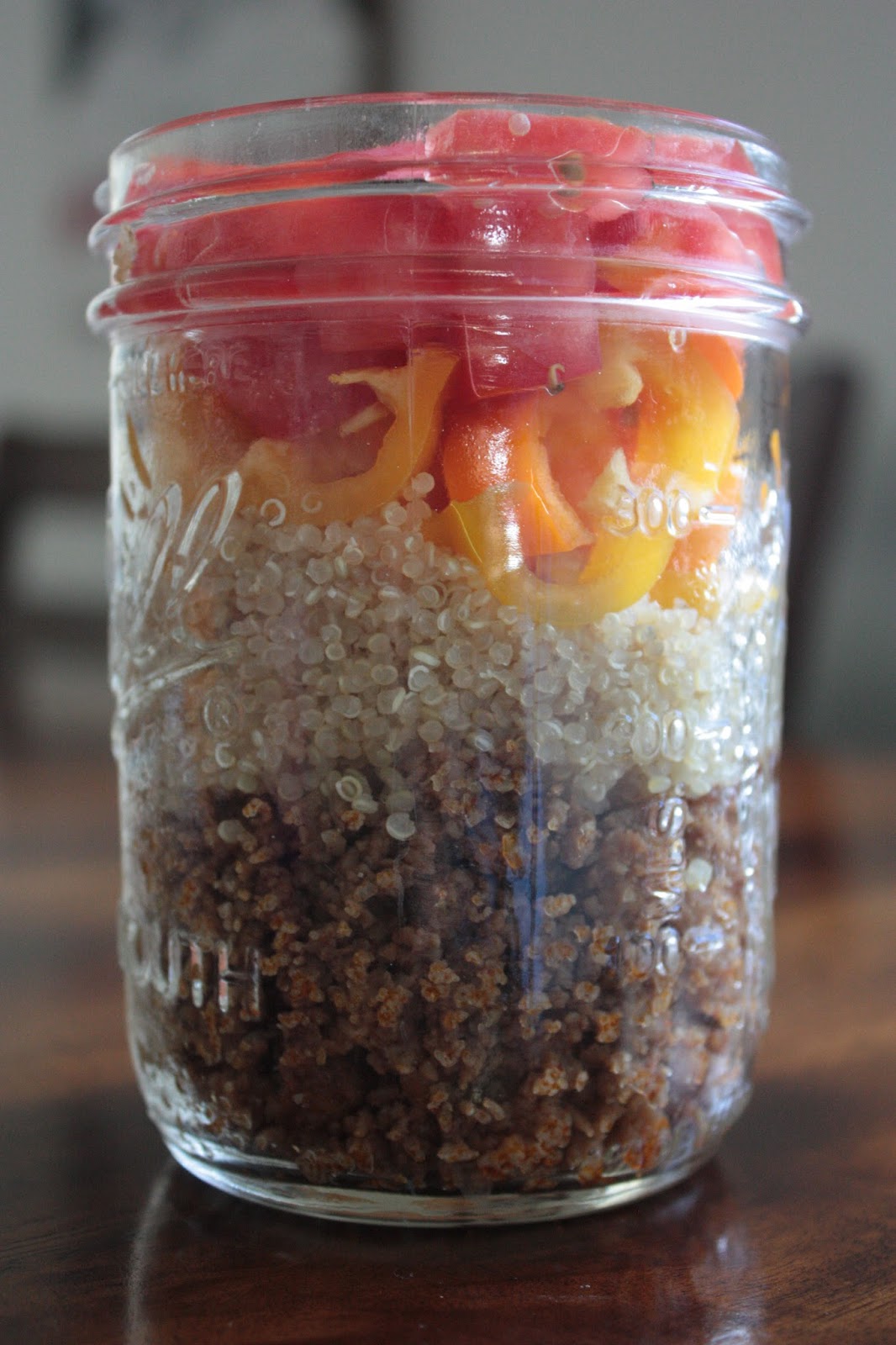 I also placed these two tasty foods in the jars in that order. Ground turkey first, then quinoa, though I honestly don’t think it matters which one goes in first.
